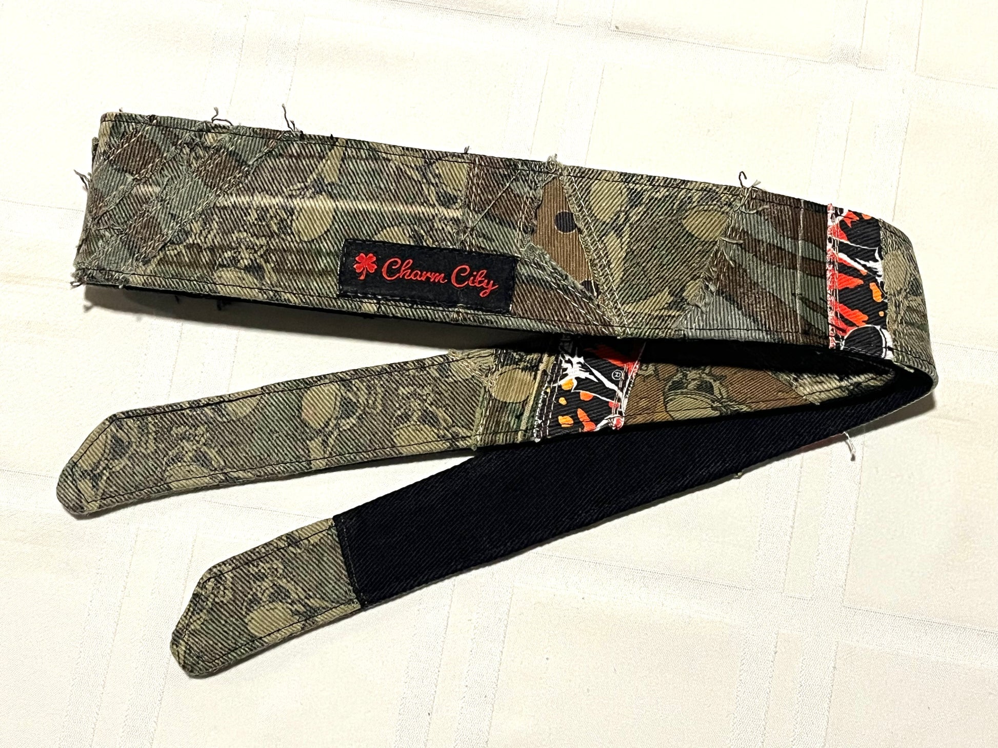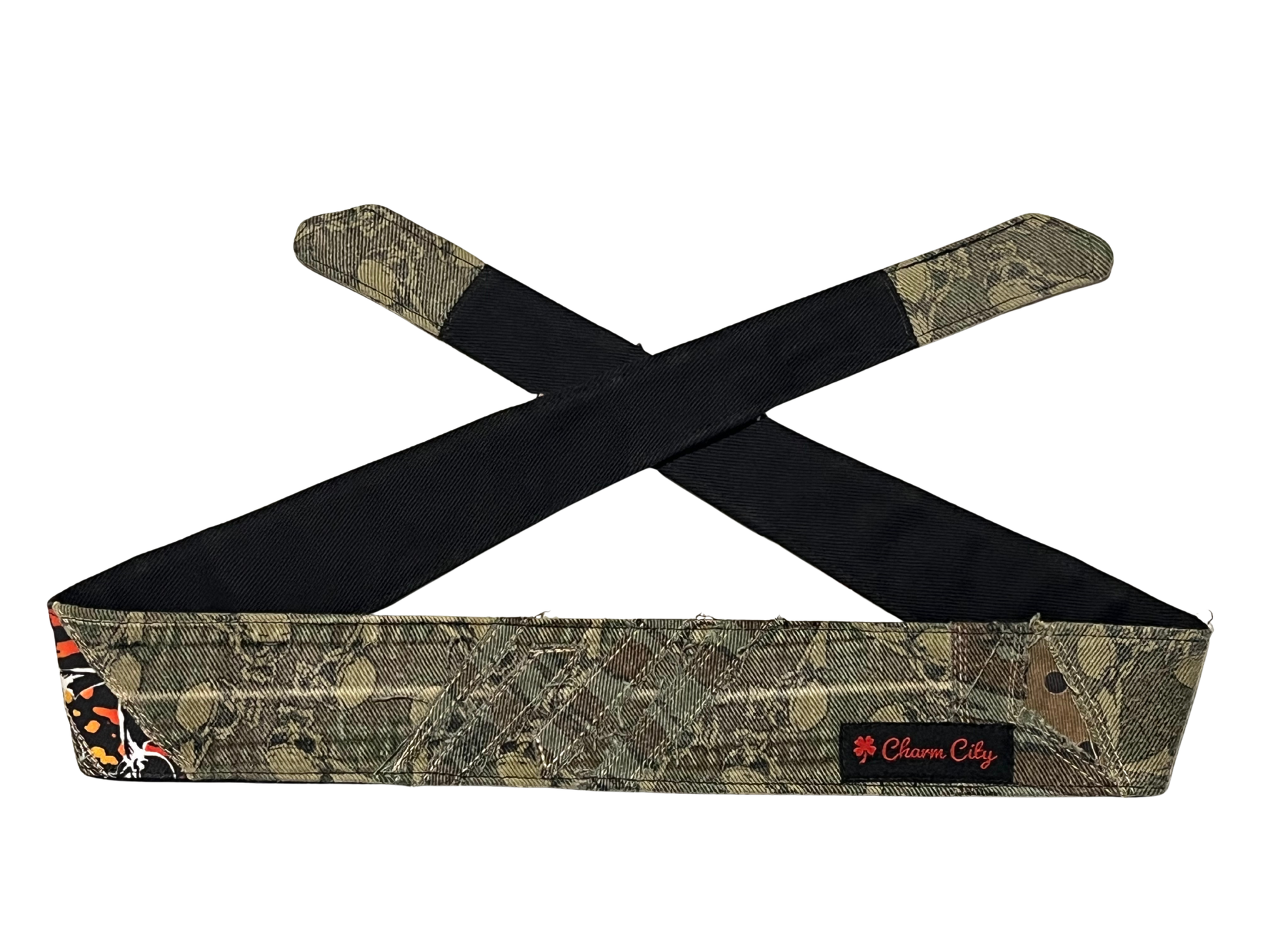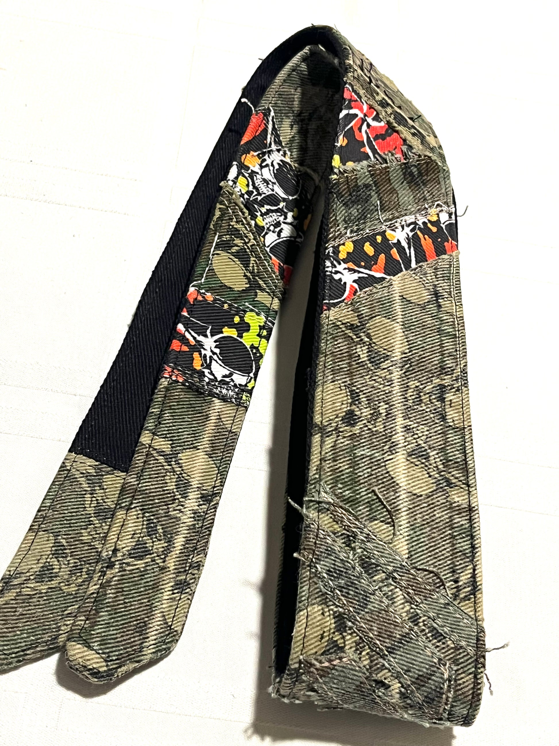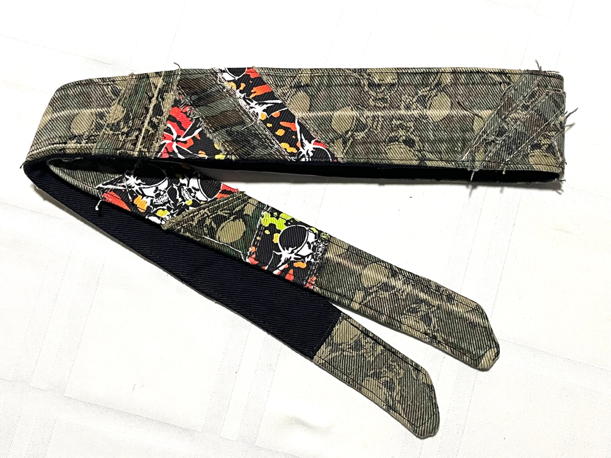 This is a custom 1/1 patchwork headband. It features a mix of flying skulls fabric. The edges are unfinished giving a worn/distressed look. The back is a really nice 10oz black denim that is soft and will stay put with one tie.